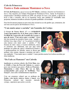 O Ciclo da Primavera, que já vai na sua 19.ª Edição, continua a decorrer em Montemor-o-Novo. Esta iniciativa da Câmara Municipal de Montemor-o-Novo, Juntas de Freguesia e Organizações Concelhias mantém em 2008, até porque foi essa a sua génese, a aposta de levar a todo o concelho, não só às freguesias rurais, mas também às localidades mais pequenas, inúmeras iniciativas culturais de grande qualidade e diversidade.